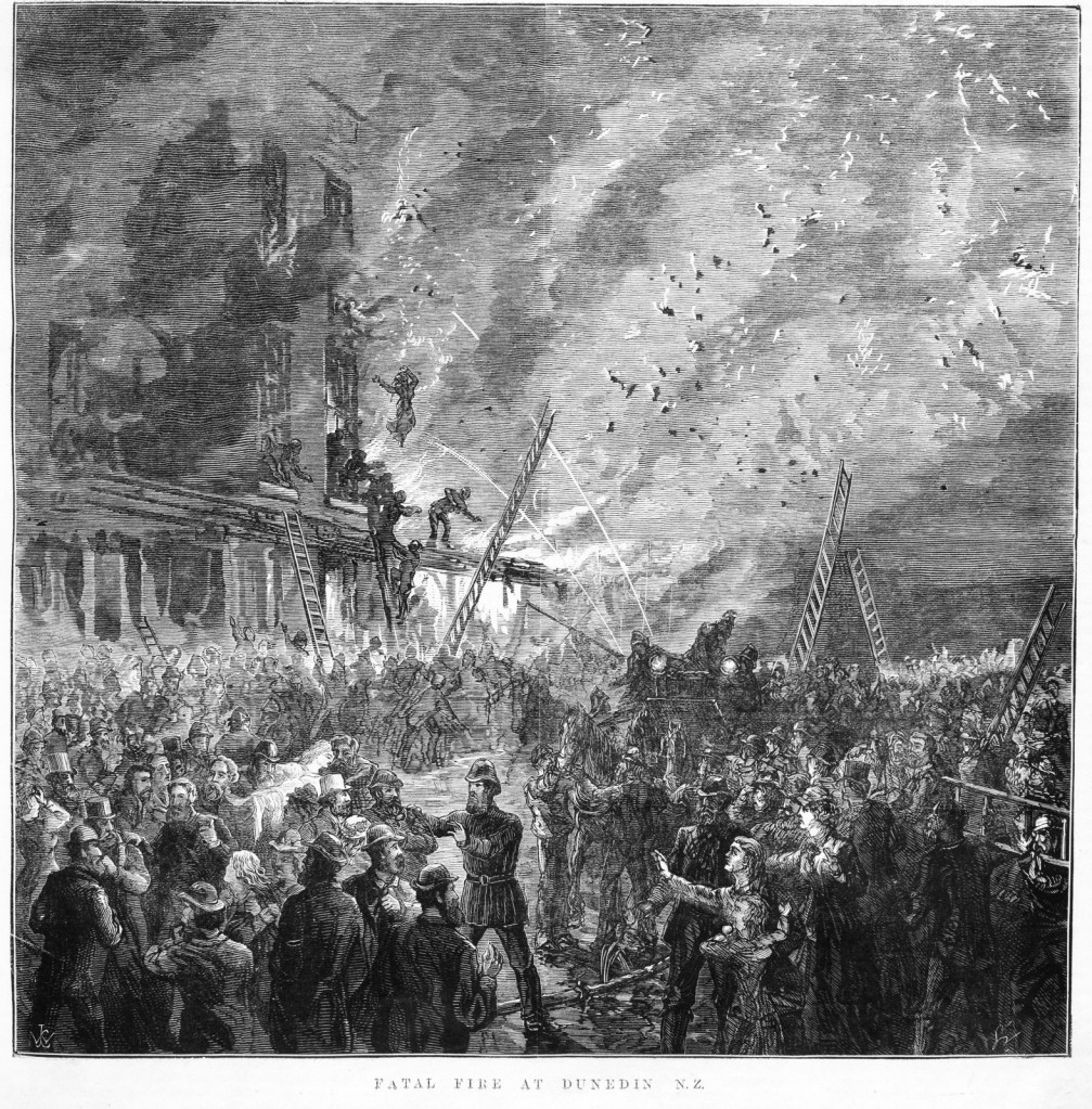 The shocking engraving below shows the fatal 1879 fire in Dunedin’s Octagon (Source: State Library of Victoria).