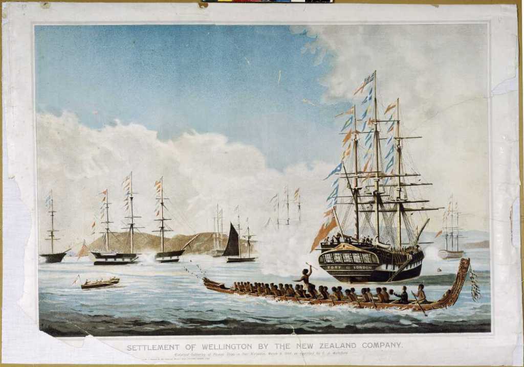 The pictures show the approximate route and a painting of the first immigrant ships to reach Wellington from Britain (Clayton, Matthew Thomas, 1831-1922: Settlement of Wellington by the New Zealand Company. Historical gathering of pioneer ships in Port Nicholson, March 8, 1840. Alexander Turnbull Library, Wellington, New Zealand.)